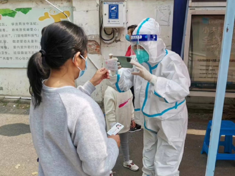 黨員志愿者王禎在鏡湖區(qū)某封控社區(qū)內(nèi)進(jìn)行核酸檢測(cè)登記。